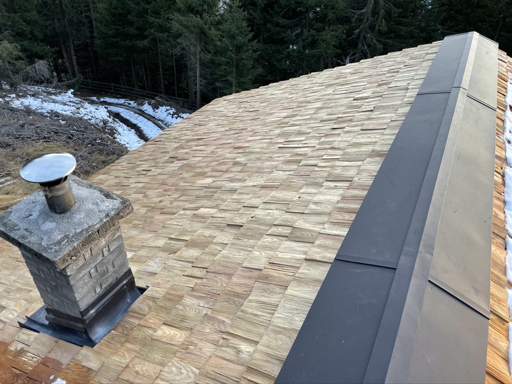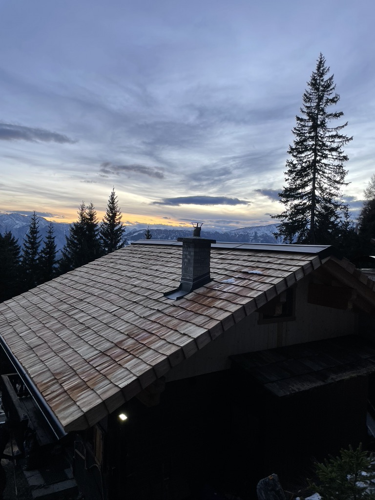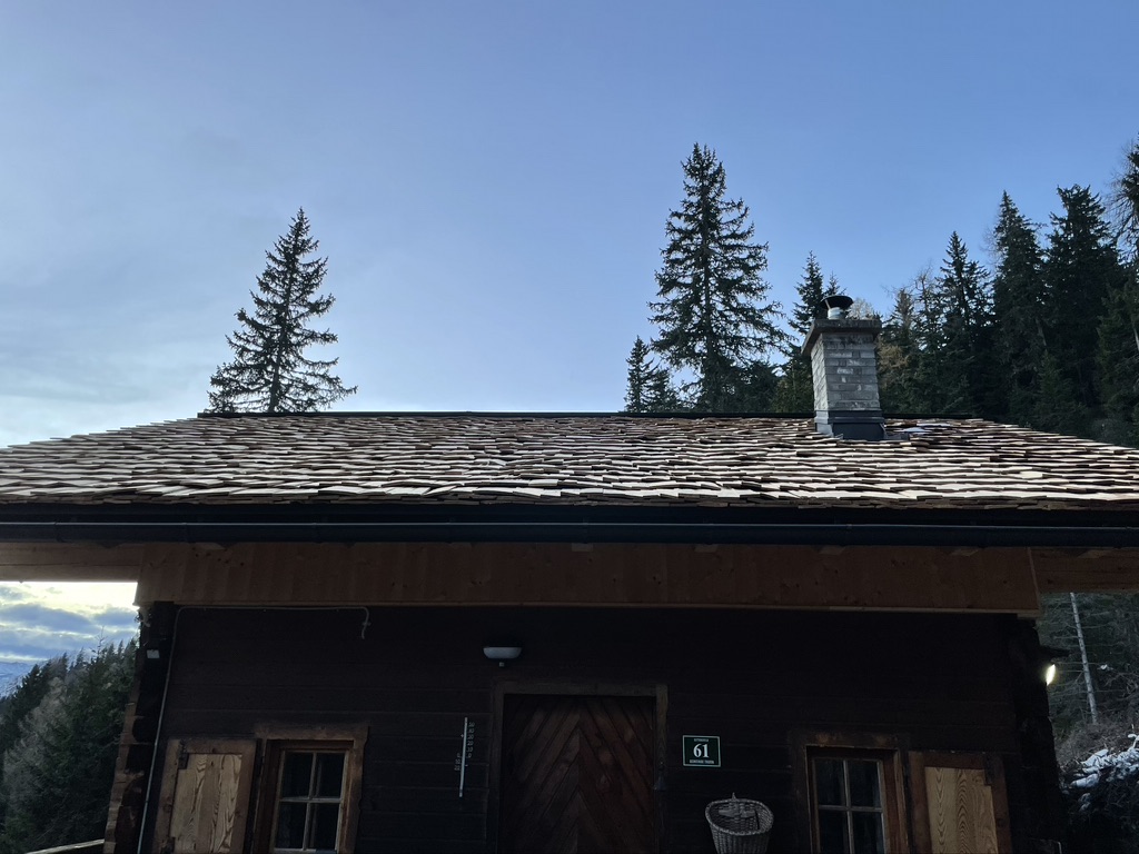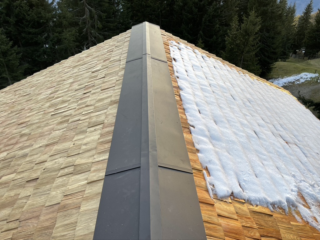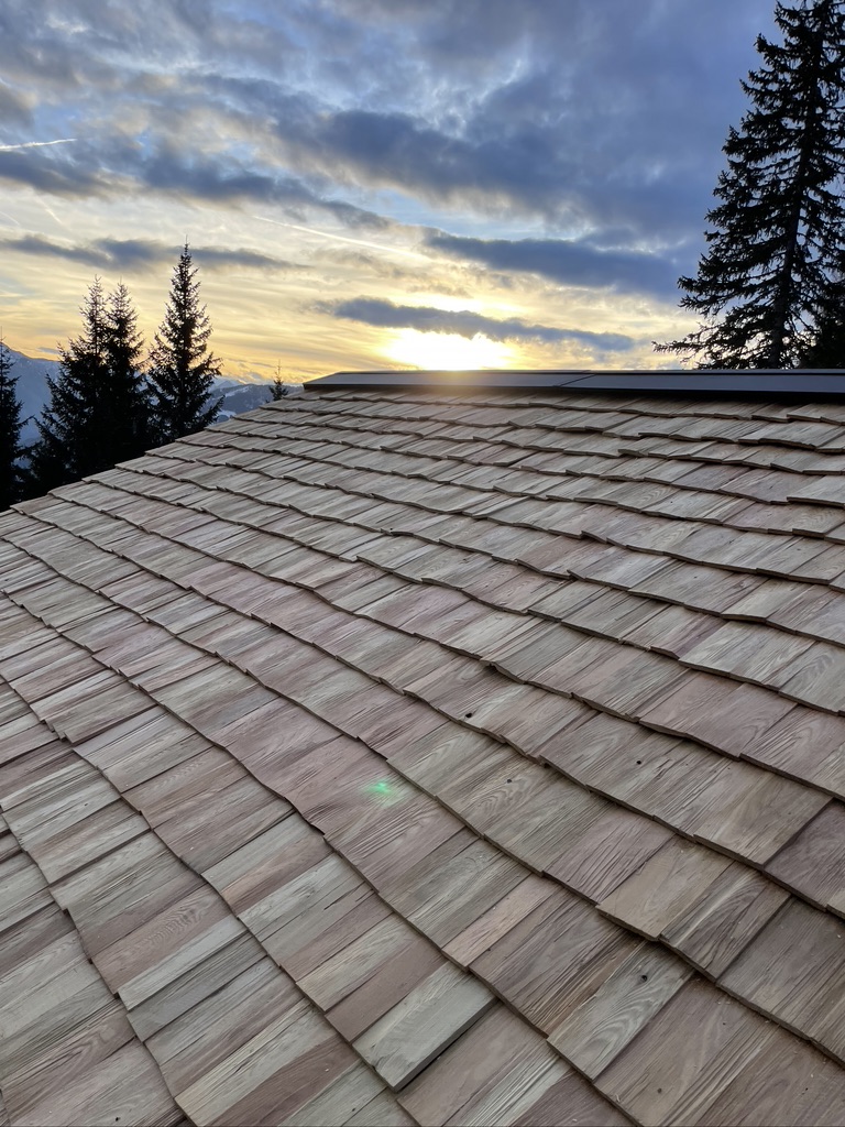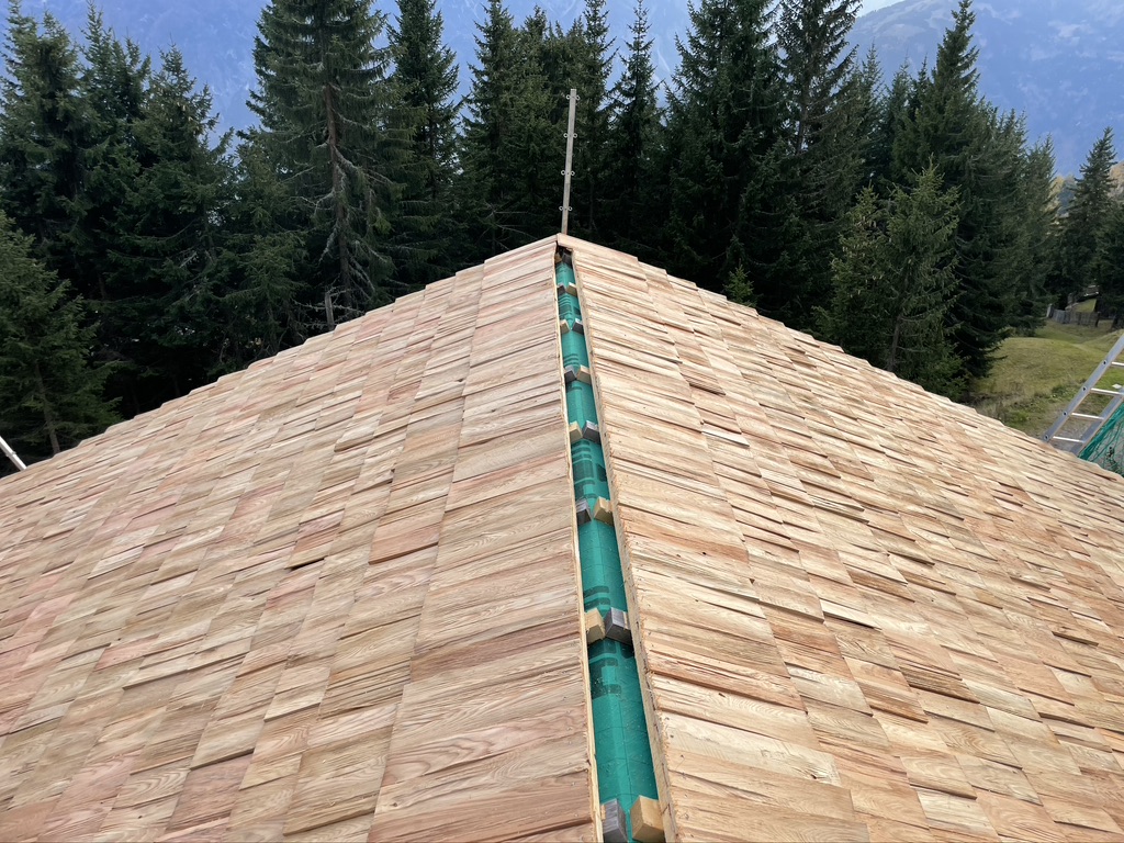 Auf der Dachstuhlkonstruktion wurde ein Kaltdach installiert, welches mit einer rustikalen Schindeleindeckung für lange Zeit eine sichere Bedachung für den Erholungsort bieten wird.
