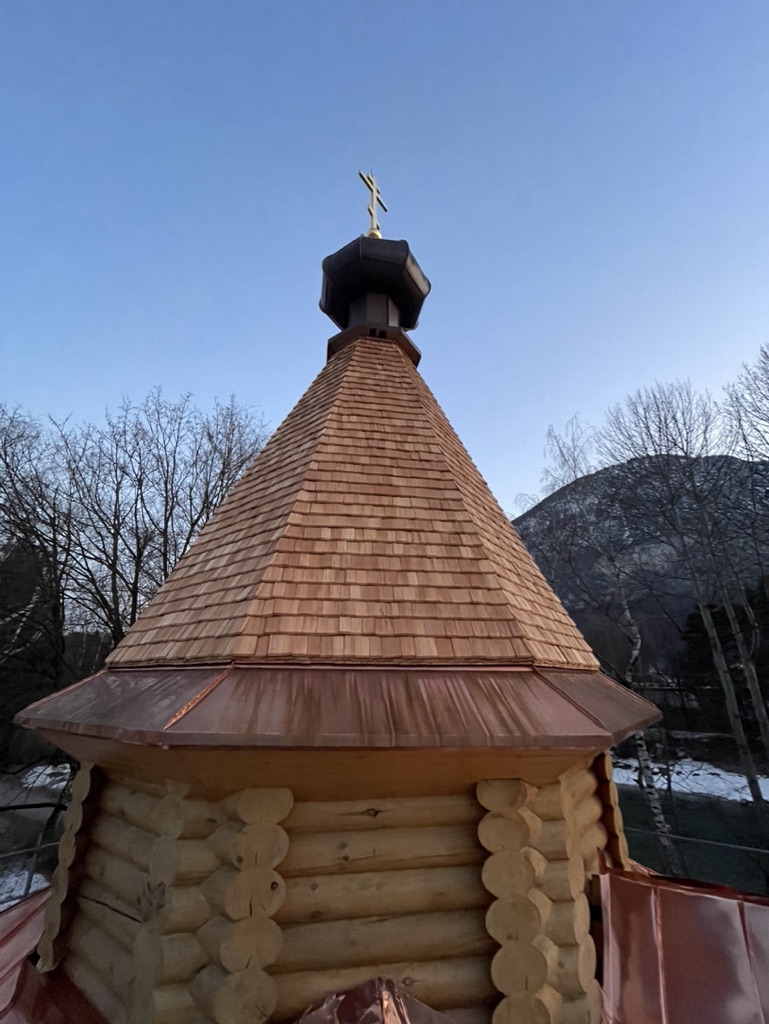 Der steile Turm der malerischen Kosakenkapelle in Lienz wurde mit Lärchenschindeln in Dreifachdeckung auf einem Kaltdach verkleidet.