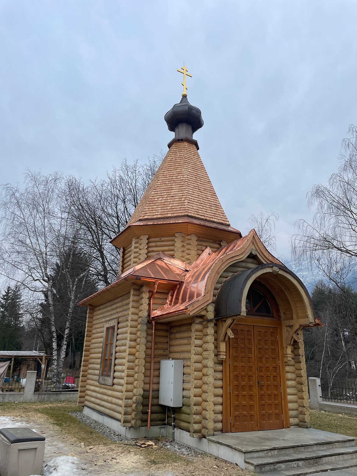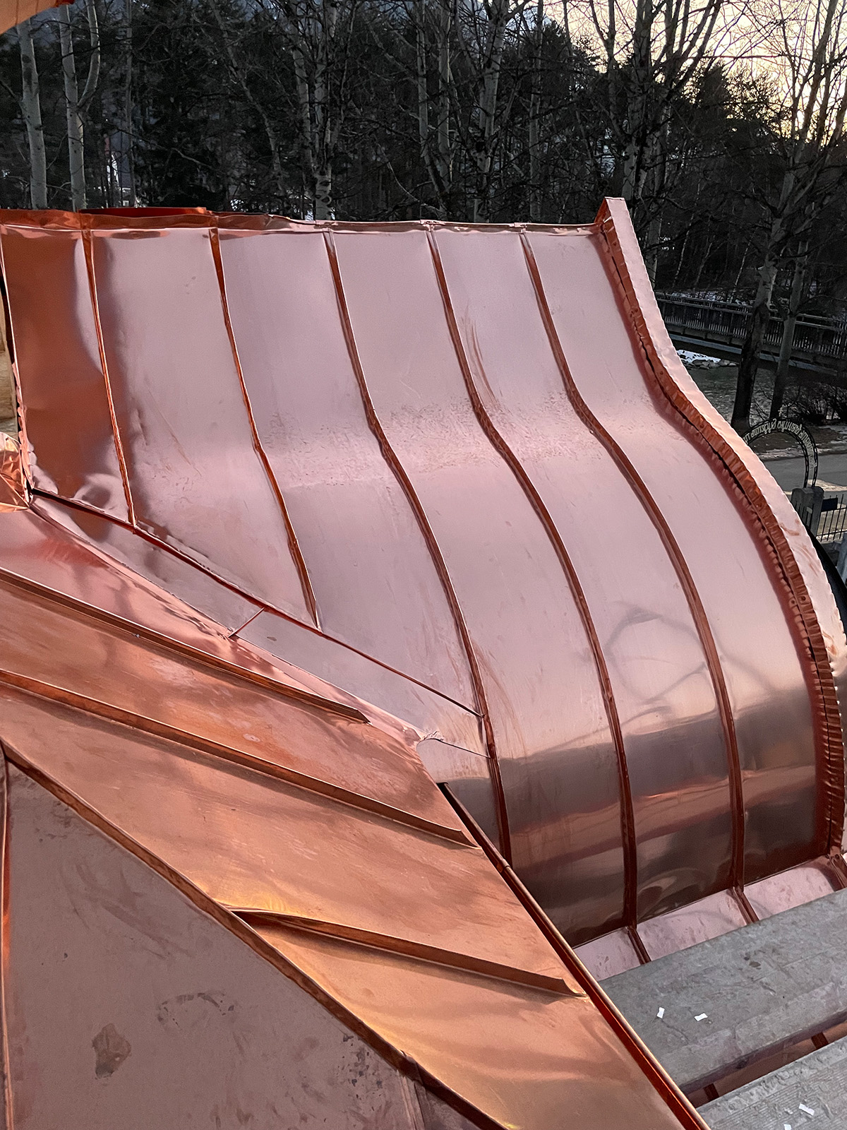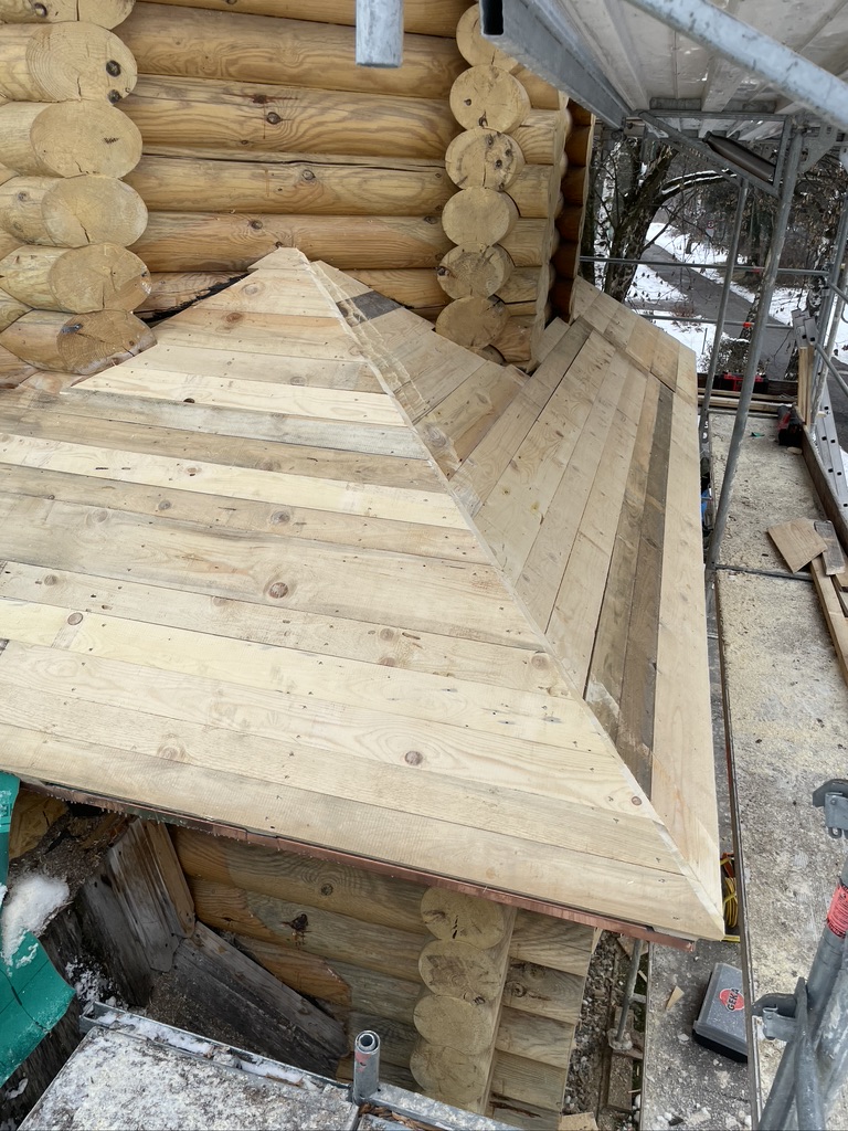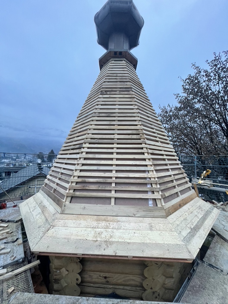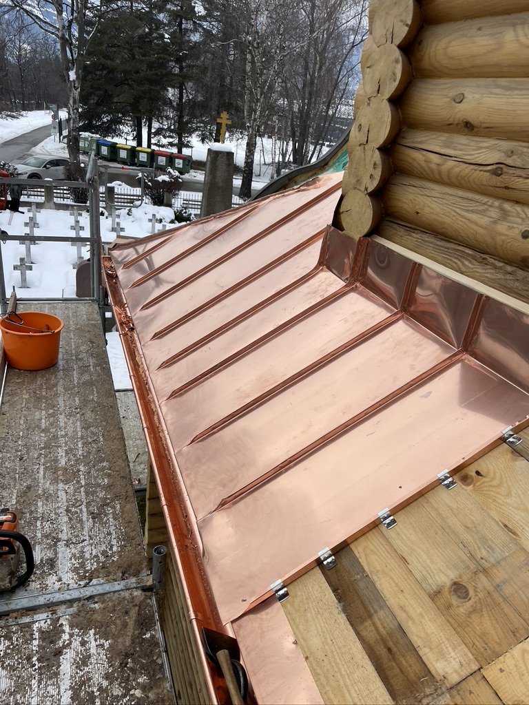 Der untere verspielte Dachbereich wurde in Kupfer gefertigt und eingekleidet, um der Kapelle möglichst lange wieder ein dichtes Dach zu garantieren.