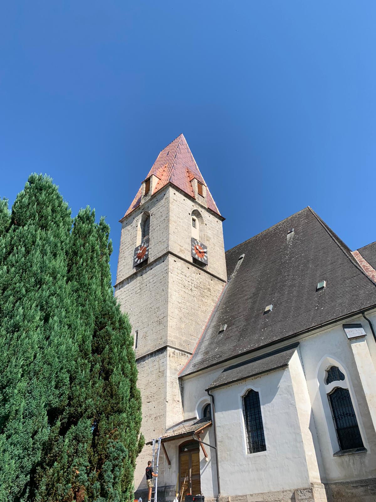 Das Steildach des Kirchturms der Pfarre Kematen an der Krems in Oberösterreich wurde neu mit Kupferblech in Tafeldeckung eingekleidet (Doppelfalzsystem). Die gesamte Eindeckung sowie die sich darunter befindliche Holzkonstruktion wurden gerüstlos renoviert bzw. erneuert.
