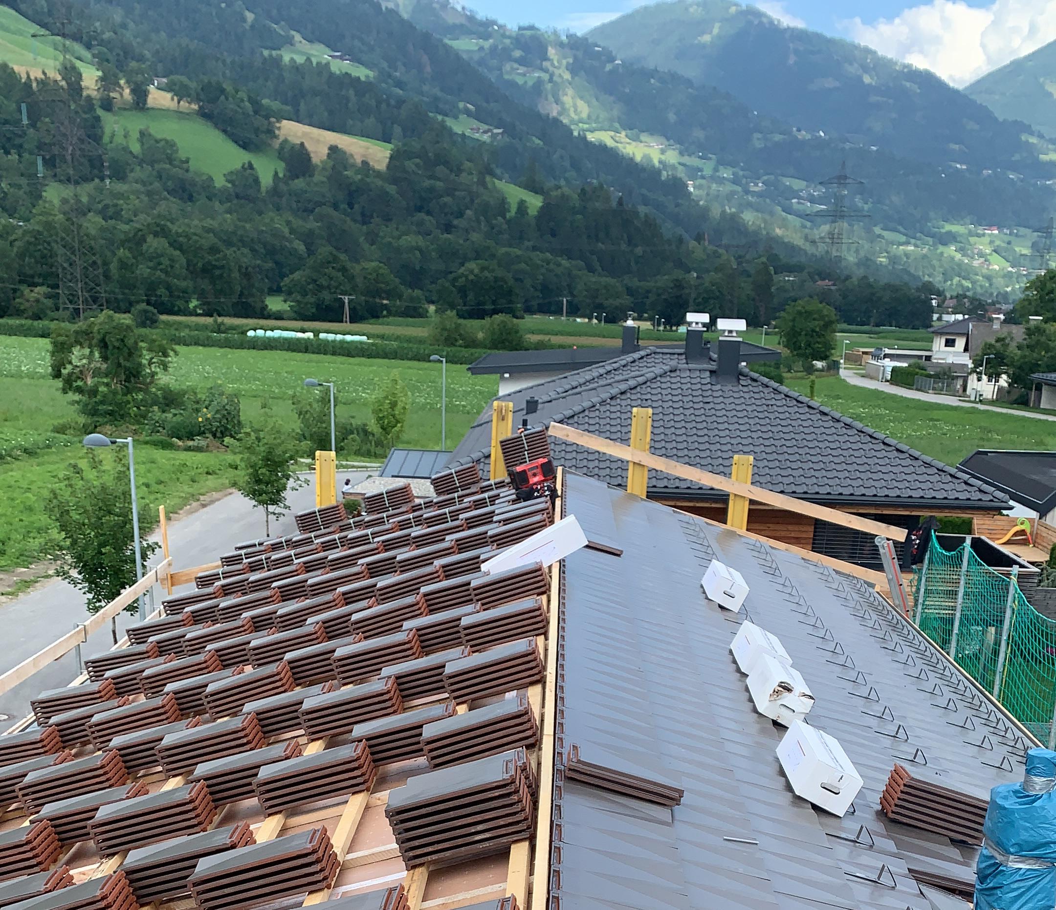 Die stabile Dachstuhlkonstruktion auf Betondecke mit Dämmung und dann Kaltdach mit diffusionsoffener Vordeckbahn und Konterlattung sowie die sorgfältige Dacheindeckung mit Premiumziegeln wie hier mit Tondachziegeln V11 wird dem Bauherrn für Jahrzehnte ein sorgenfreies Heim bescheren.